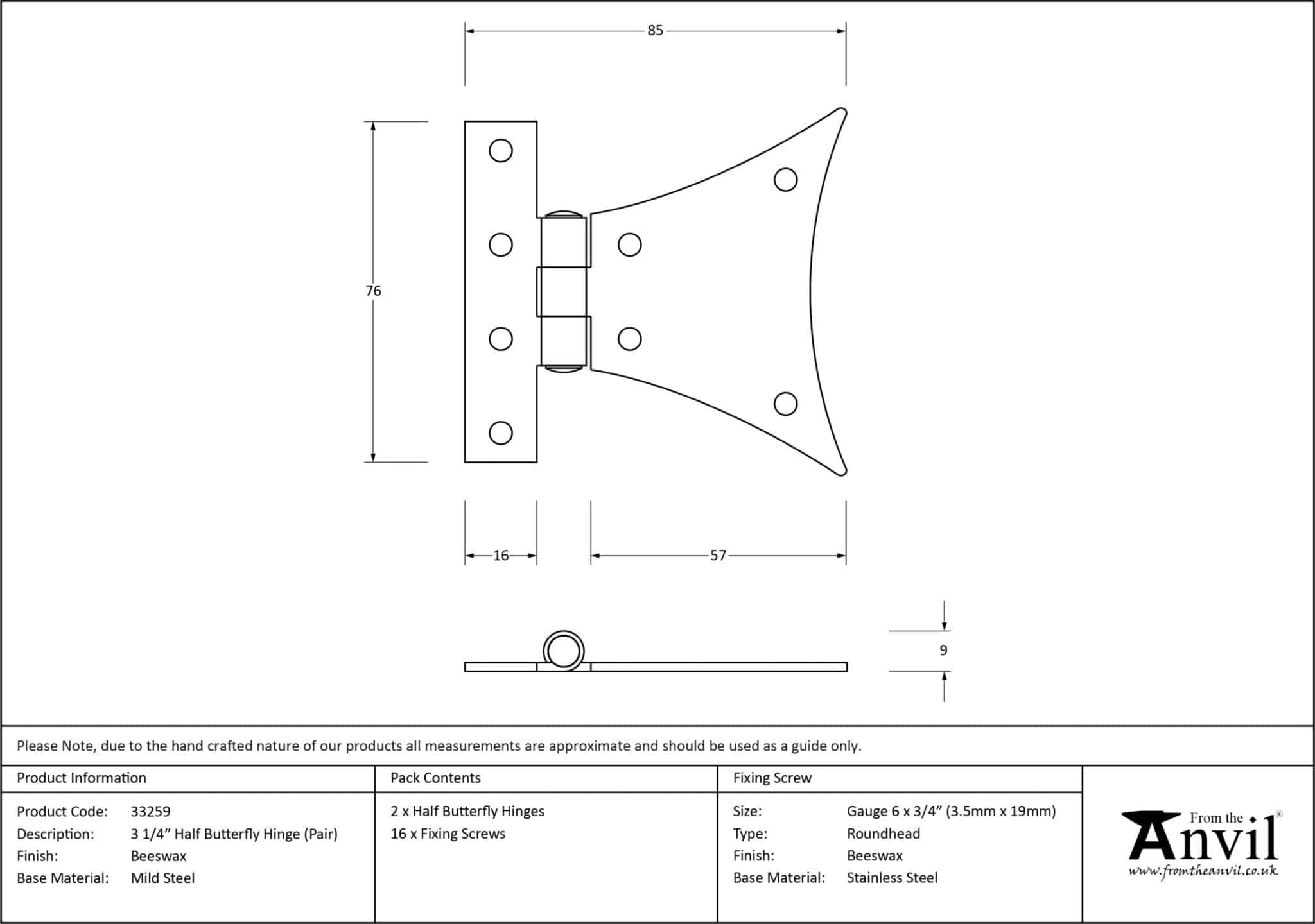 Beeswax 3¼” Half Butterfly Hinge (pair)