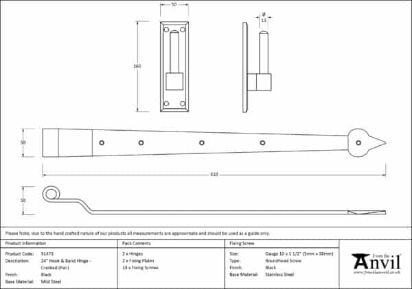 Black 24″ Hook & Band Hinge – Cranked (pair)