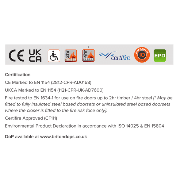 Briton’s 2003V Door Closer is an extremely reliable and versatile choice of door closer. With a 10 Year manufacturer’s guarantee, it meets the requirements of EN1154 and it is UKCA and CE Marked. It is rated EN1634 fire tested at 2 hours for timber fire doors and 4 hours for steel fire doors as well as being Certifire approved to CF111 (please note that approval covers regular and transom applications only).