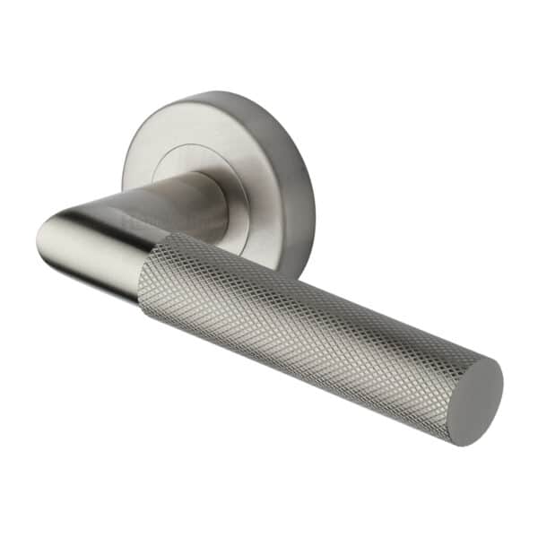 Heritage Brass Door Handle Lever Latch on Round Rose Bauhaus Mitre Knurled Design Satin Nickel Finish