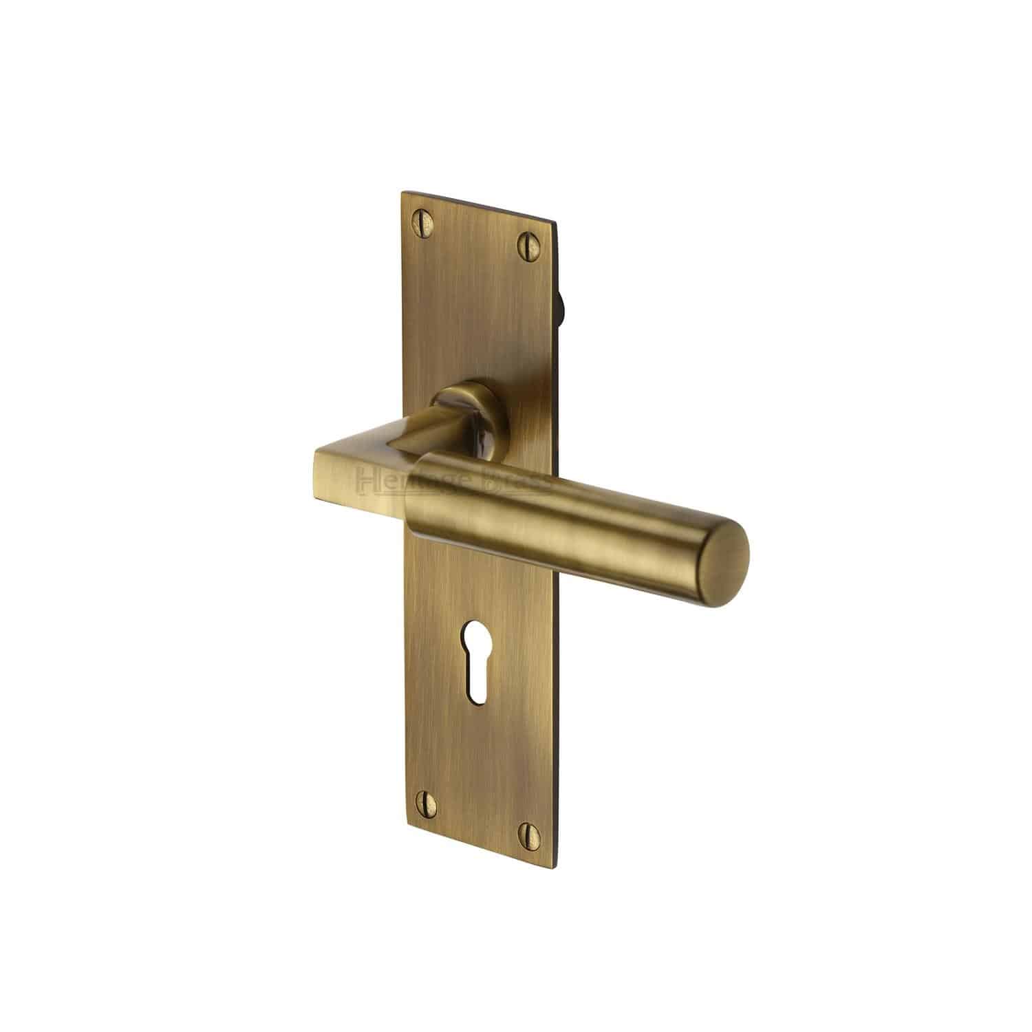 Heritage Brass Door Handle Lever Lock Bauhaus Design Antique Brass Finish