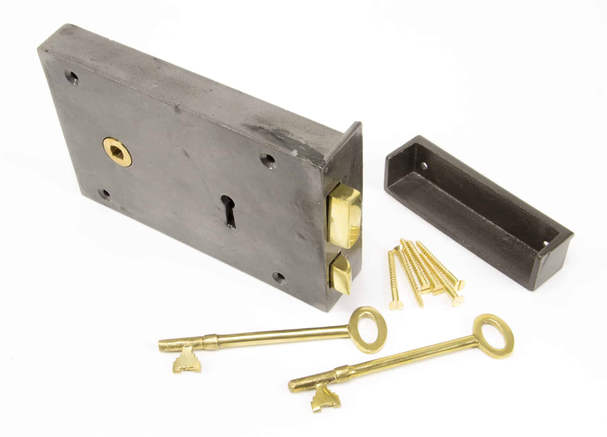 Rim locks are fitted to the surface of the door rather than being morticed in, along with a surface mounted keep that should be fitted to the door frame.