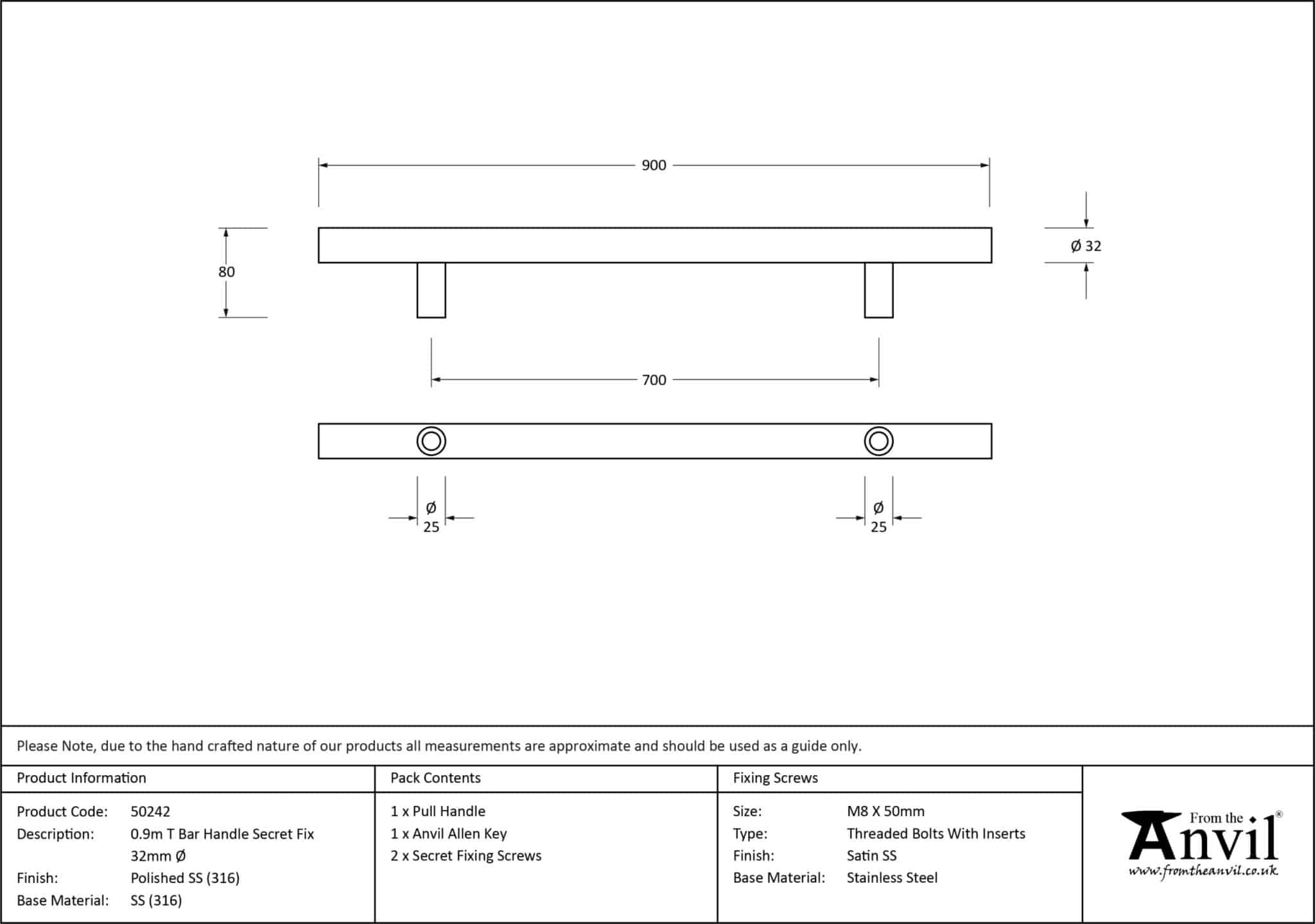 Polished SS (316) 0.9m T Bar Handle Secret Fix 32mm Ø