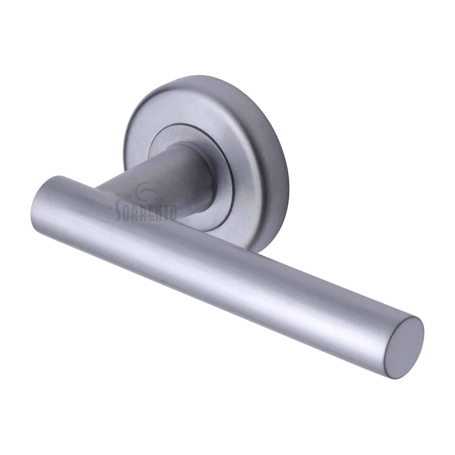 Sorrento Door Handle Lever Latch on Round Rose Shuttle Design Satin Chrome Finish