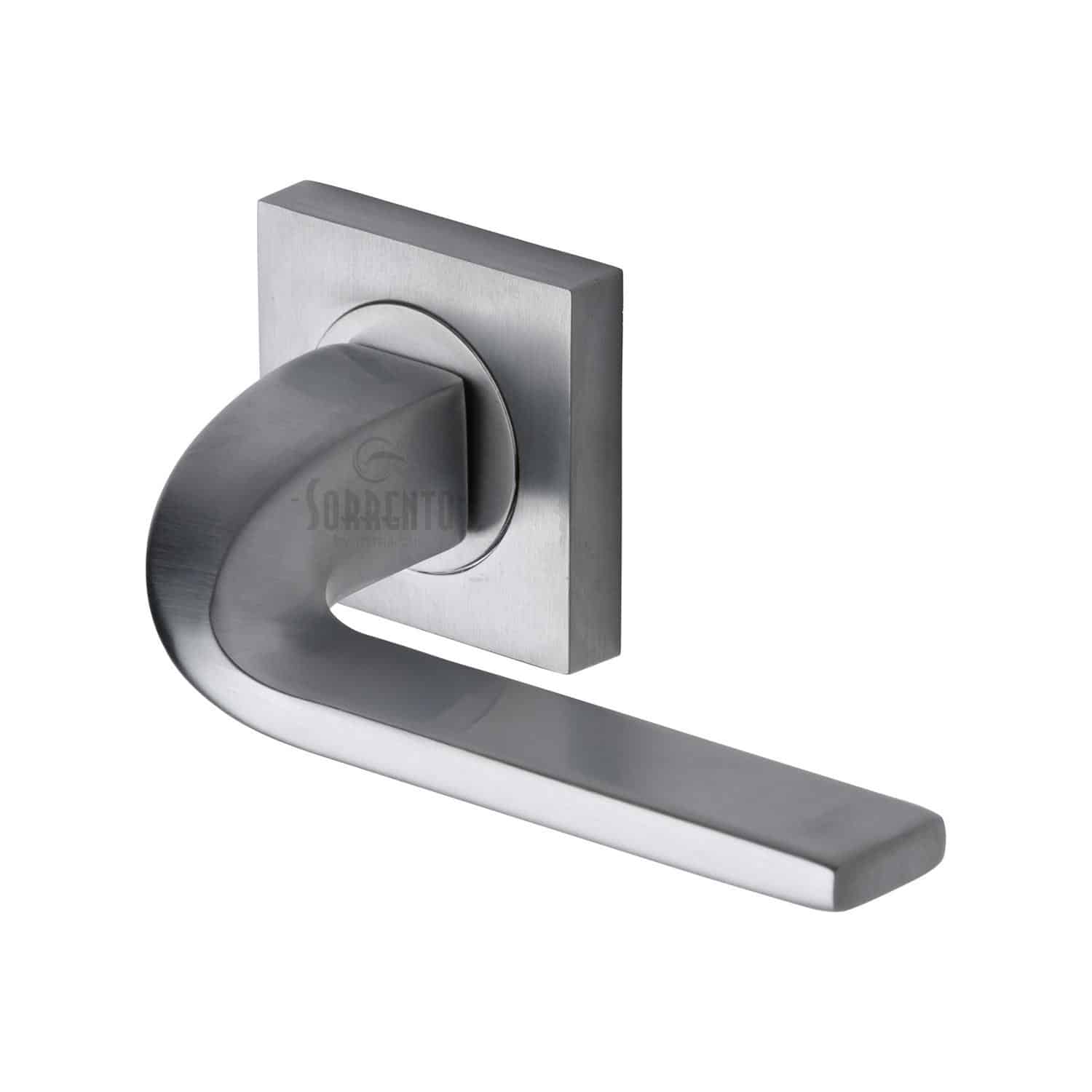 Sorrento Door Handle Lever Latch on Round Rose Stanford Design Satin Chrome Finish