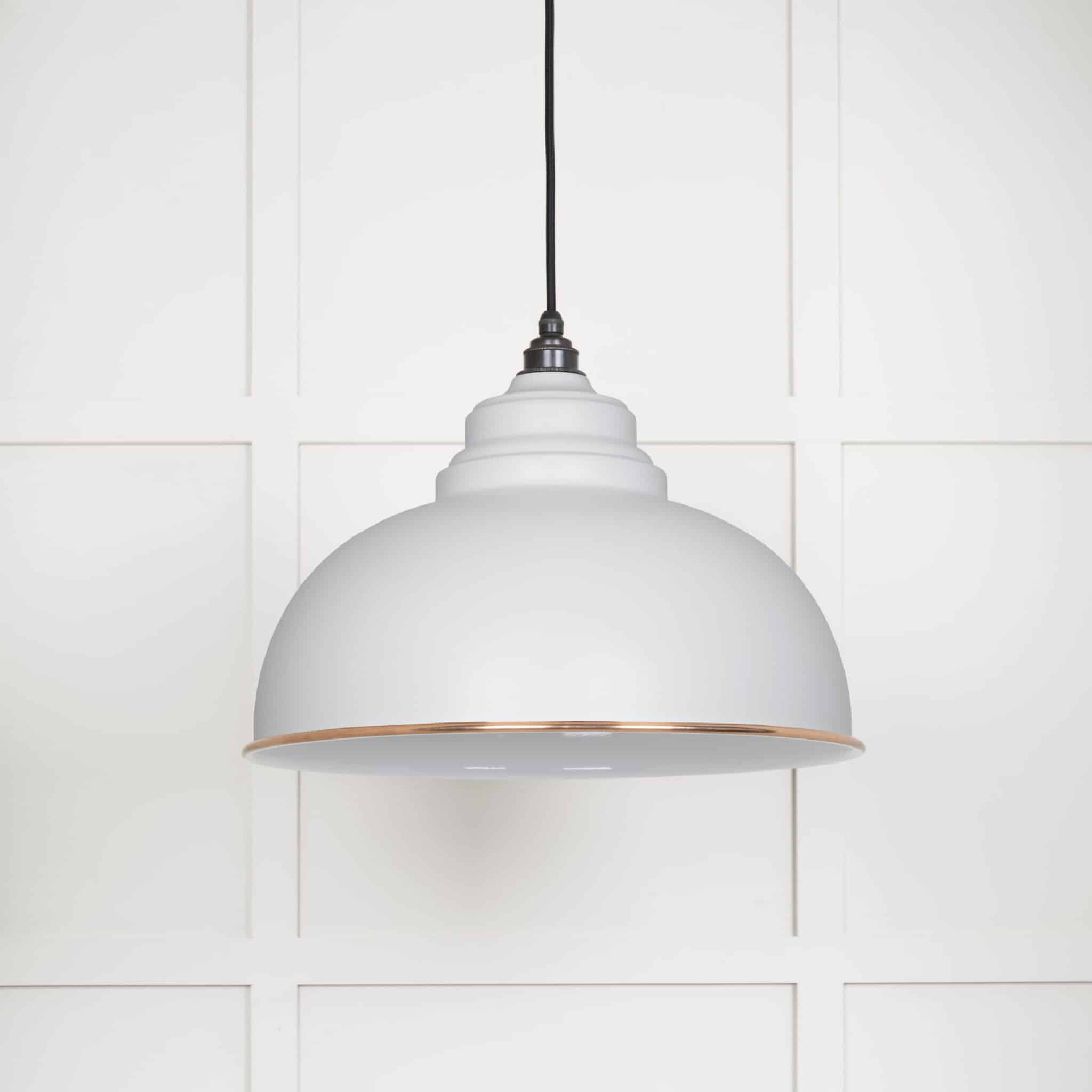Our Accent pendants are spun from solid copper. When lit, the white gloss interior bounces light and creates a radiant glow, the brightest of our finishes. These pendants work well with a warmer bulb.